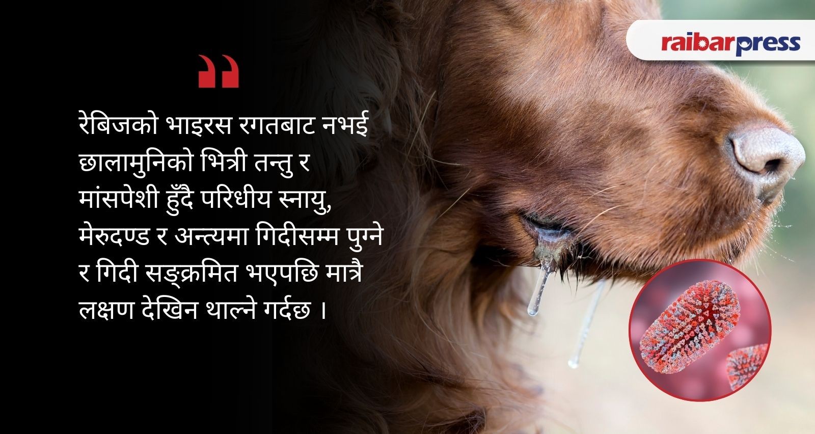कुकुरलाई रेबिजविरुद्धको खोप लगाउँदा रेबिज फैलन पाउँदैन । रेबिजको भाइरस रगतबाट नभई छालामुनिको भित्री तन्तु र मांसपेशी हुँदै परिधीय स्नायु, मेरुदण्ड र अन्त्यमा गिदीसम्म पुग्ने र गिदी सङ्क्रमित भएपछि मात्रै लक्षण देखिन थाल्ने गर्दछ । मानिसमा यो रोग लागेपछि ढिलोचाँडो मृत्यु निश्चित हुने गर्दछ । स्वास्थ्य तथ्याङ्कअनुसार नेपालमा बर्सेनि दुई सय बिरामीको रेबिजका कारण मृत्यु हुने गरेको छ ।
