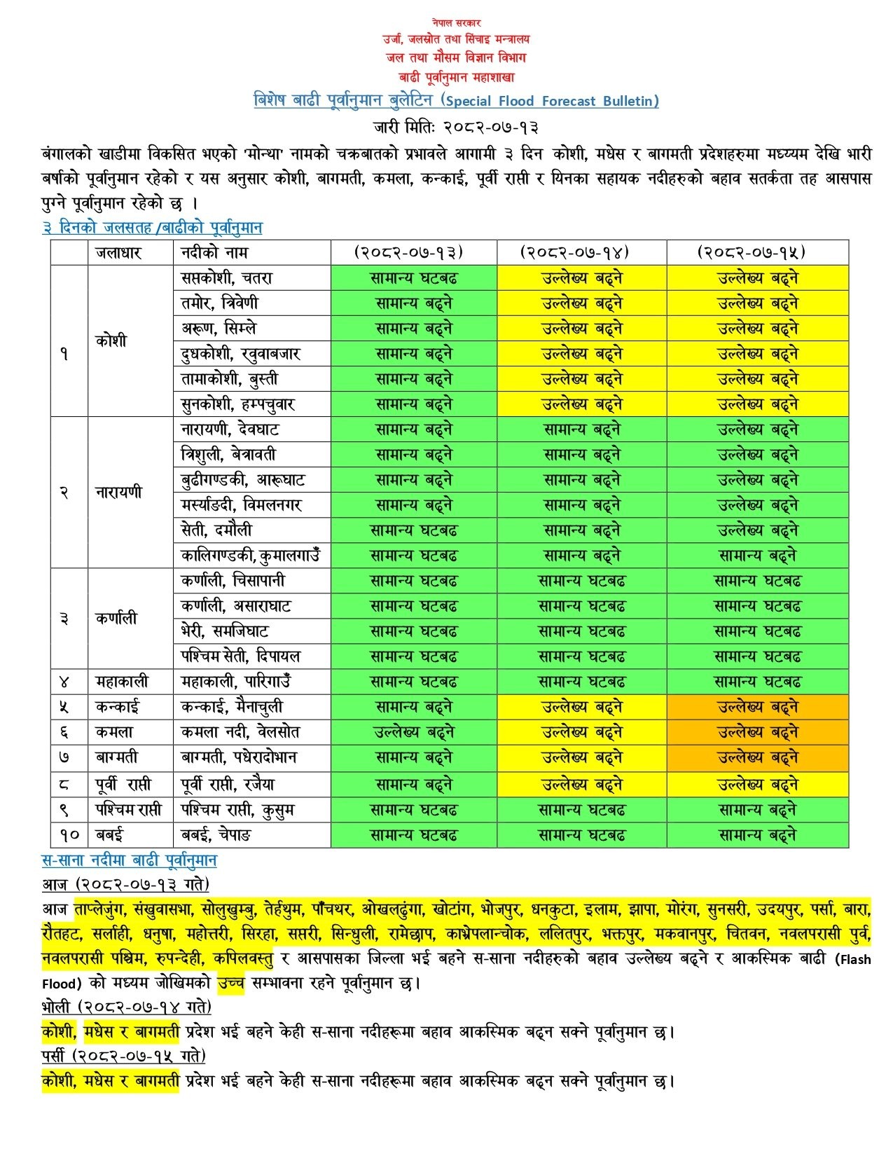आज ताप्लेजुङ, संखुवासभा, सोलुखुम्बु, तेह्रथुम, पाँचथर, ओखलढुंगा, खोटाङ, भोजपुर, धनकुटा, इलाम, झापा, मोरङ, सुनसरी, उदयपुर, पर्सा, बारा, रौतहट, सर्लाही, धनुषा, महोत्तरी, सिराहा, सप्तरी, सिन्धुली, रामेछाप, काभ्रेपलान्चोक, ललितपुर, भक्तपुर, मकवानपुर, चितवन, नवलपरासी (पूर्व–पश्चिम), रुपन्देही र कपिलवस्तु जिल्लाबाट बग्ने साना नदीहरूको बहाव उल्लेख्य रूपमा बढ्ने सम्भावना रहेको महाशाखाले जनाएको छ।
