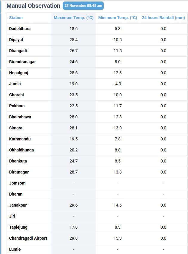 केही दिनयता काठमाडौँ उपत्यकासहित देशभर चिसो द्रुत गतिमा बढिरहेको छ। आइतबार बिहान जुम्लाको न्यूनतम तापक्रम झन्डै माइनस ५ डिग्री सेल्सियसमा झरेको छ।