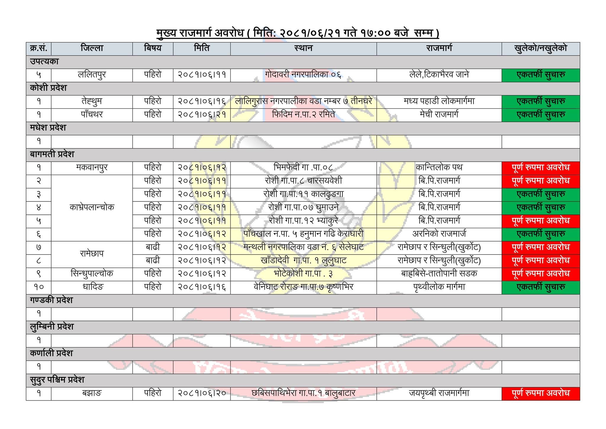 ललितपुरको लेले, टिकाभैरव जाने बाटो, तेह्रथुमको लालिगुराँस नगरपालिकाको मध्यपहाडी सडक खण्ड एकतर्फी सुचारु भएको छ। मकवानपुर जिल्ला भित्रको कान्तिलोक पथ, काभ्रे जिल्लाको रोशी गा.पा. बि.पि राजमार्ग खण्ड पुर्ण रुपमा अवरोध रहेको छ ।