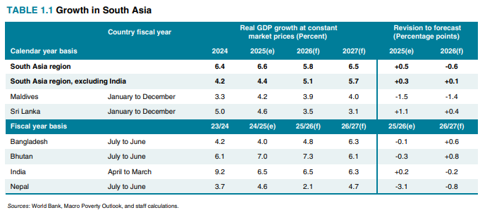 चालु आर्थिक वर्षमा दक्षिण एसियाली क्षेत्रको औसत वृद्धि दर ५.८ प्रतिशत रहने विश्व बैंकले अनुमान गरेको छ। अन्य देशहरूमा भुटानको वृद्धि दर ७.३ प्रतिशत, भारतको ६.५ प्रतिशत, बंगलादेशको ४.८ प्रतिशत, माल्दिभ्सको ३.९ प्रतिशत र श्रीलंकाको ३.५ प्रतिशत रहनेछ।
