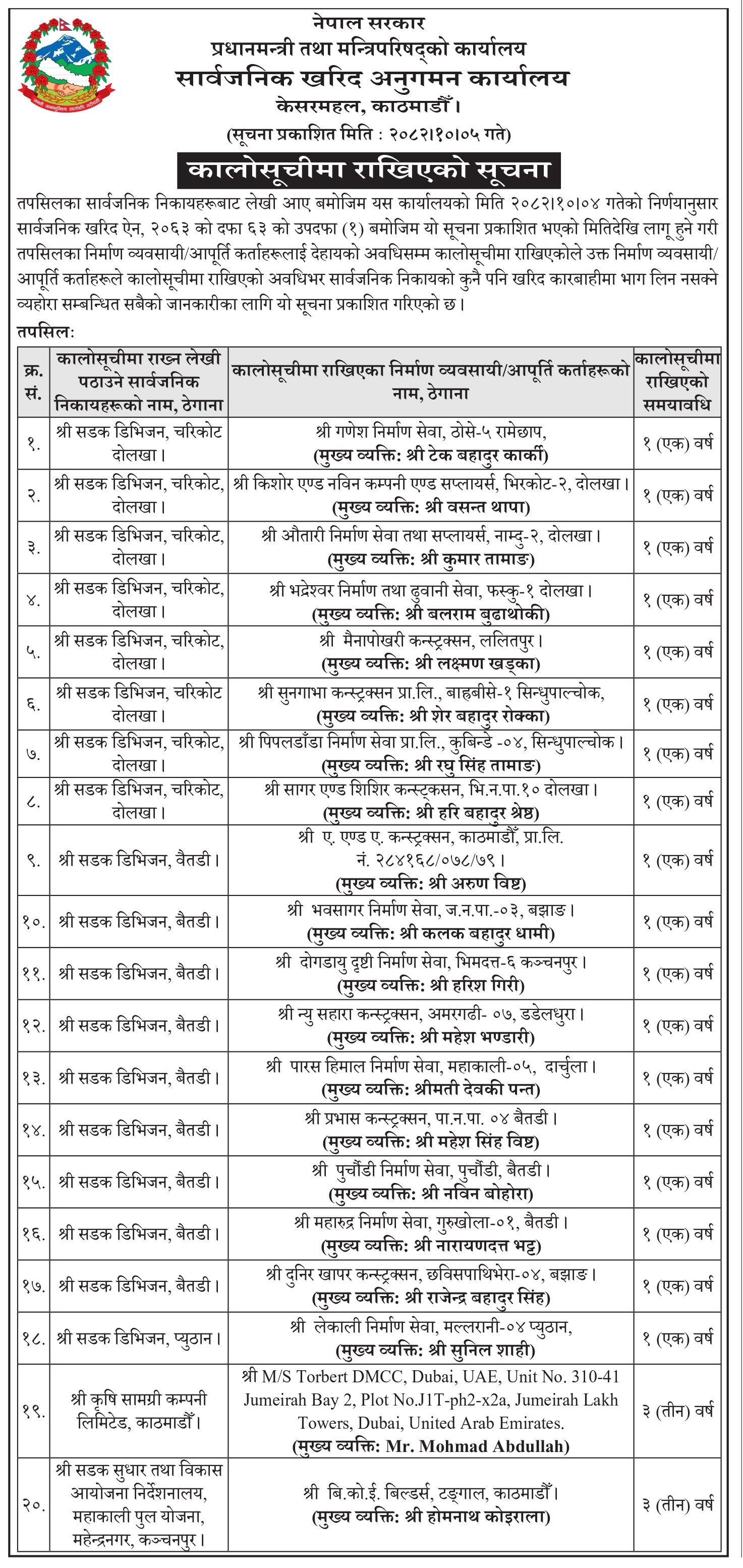 यी २० वटा निर्माण व्यवसायी तथा आपूर्तिकर्ता परे कालोसूचीमा