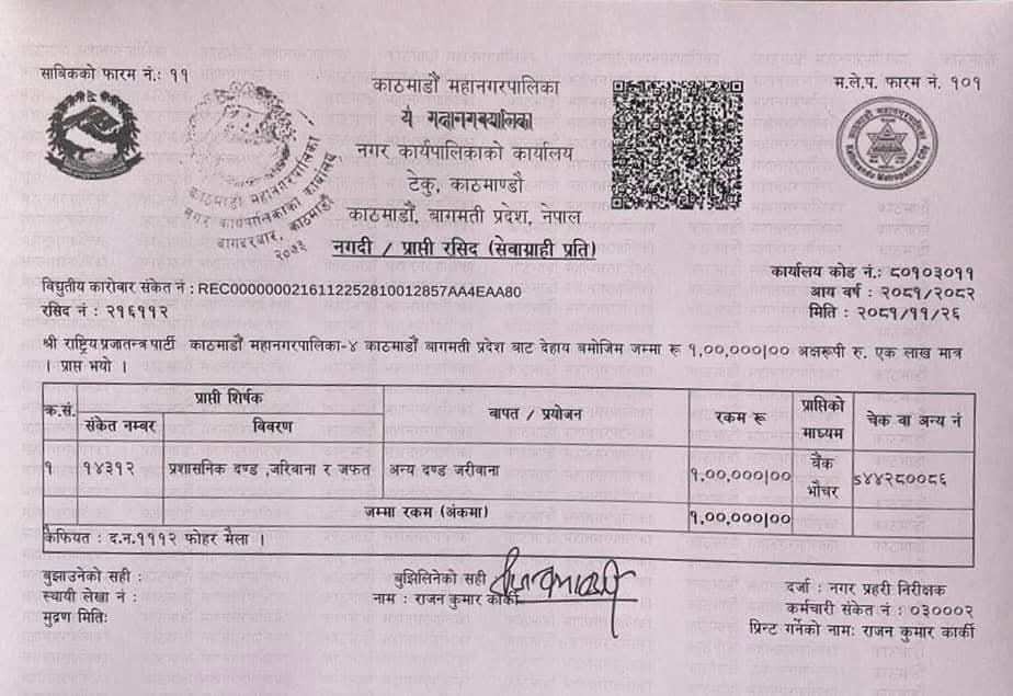 काठमाडौं । राष्ट्रिय प्रजातन्त्र पार्टी (राप्रपा)ले काठमाडौं महानगरलाई एक लाख रुपैयाँ जरिवाना तिरेको छ ।
