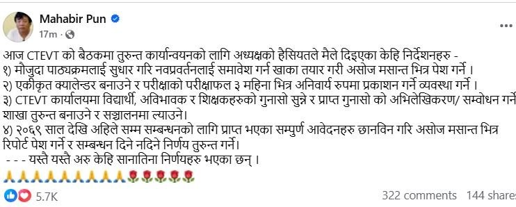 शिक्षा, विज्ञान तथा प्रविधिमन्त्री महावीर पुनले प्राविधिक शिक्षा तथा व्यावसायिक तालिम परिषद् (सीटीईभीटी) लाई चार बुँदे निर्देशन दिएका छन्।