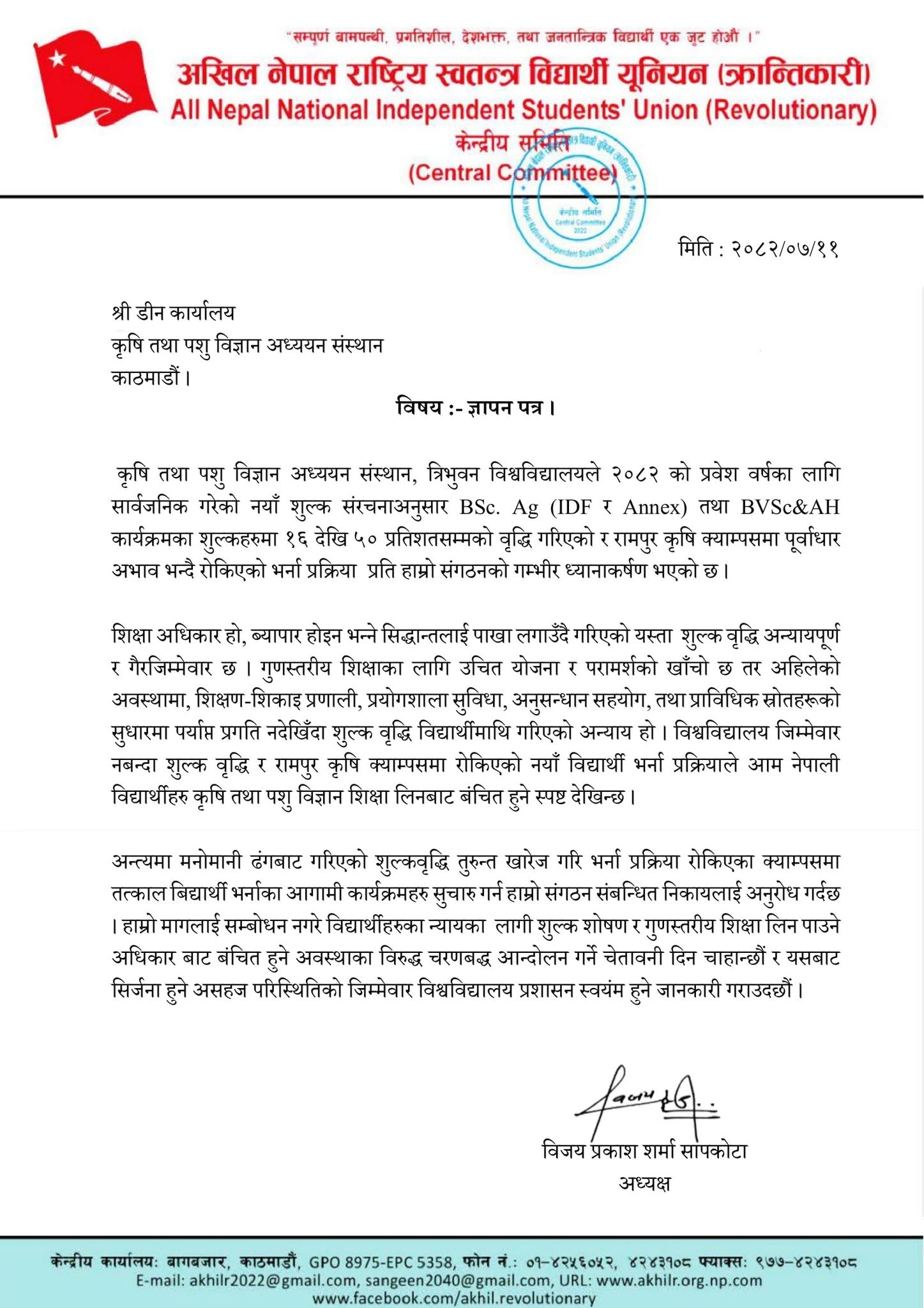 ज्ञापनपत्रमा भनिएको छ, “विश्वविद्यालय जिम्मेवार नबन्दा शुल्क वृद्धि र रामपुर कृषि क्याम्पसमा रोकिएको नयाँ भर्ना प्रक्रियाले आम नेपाली विद्यार्थीहरू कृषि तथा पशु विज्ञान शिक्षा लिनबाट वञ्चित हुने खतरा बढेको छ।”