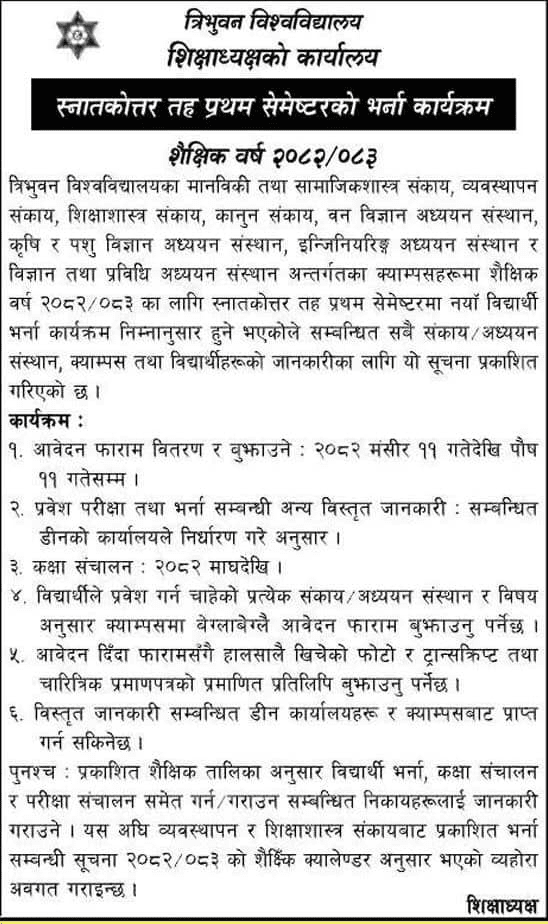 त्रिभुवन विश्वविद्यालयले स्नातकोत्तर तह प्रथम सेमेस्टरको भर्ना मङ्सिर ११ गतेदेखि खुला गर्ने भएको छ। विश्वविद्यालयले आज जारी सूचना अनुसार मङ्सिर ११ गतेदेखि पौष ११ गतेसम्म आवेदन बुझाउन सकिने व्यवस्था गरिएको छ।