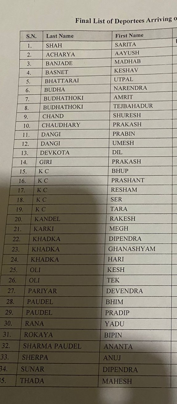अमेरिकाको अप्रवासन नीतिविपरीत त्यहाँ बसोबास गर्दै आएका ३५ नेपालीलाई मंगलबार राति अमानवीय व्यवहार गर्दै नेपाल फिर्ता (डिपोर्ट) गरिएको छ।