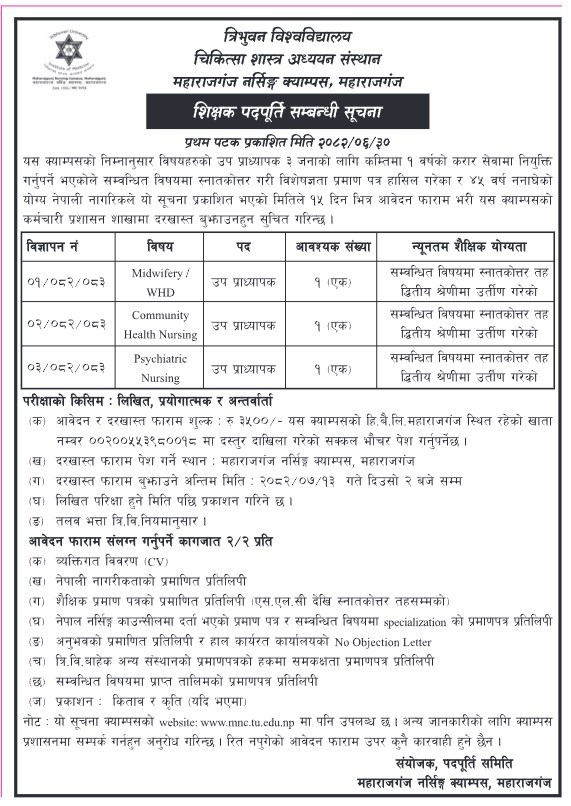 त्रिभुवन विश्वविद्यालय चिकित्सा शास्त्र अध्ययन संस्थान अन्तर्गतको महाराजगञ्ज नर्सिङ क्याम्पसले करार सेवाका लागि तीनजना उप–प्राध्यापक माग गरेको छ।
