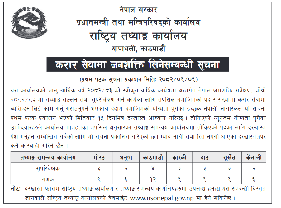 राष्ट्रिय तथ्याङ्क कार्यालयमा करार सेवामा सुपरिवेक्षक र गणकका लागि दरखास्त आव्हान