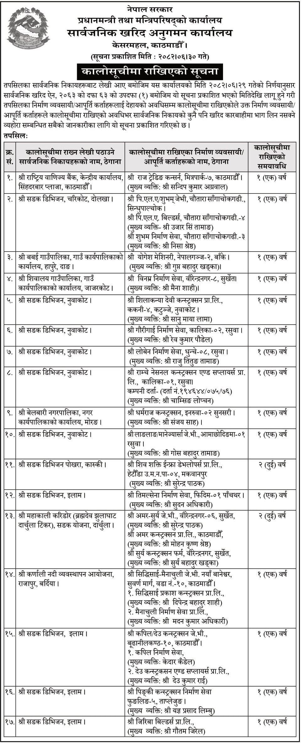 प्रधानमन्त्री तथा मन्त्रिपरिषद्को कार्यालयअन्तर्गतको सार्वजनिक खरिद अनुगमन कार्यालयले बिहीबार सूचना प्रकाशित गर्दै ती कम्पनीहरूलाई एकदेखि दुई वर्षसम्मका लागि कालोसूचीमा राखिएको जानकारी दिएको हो।