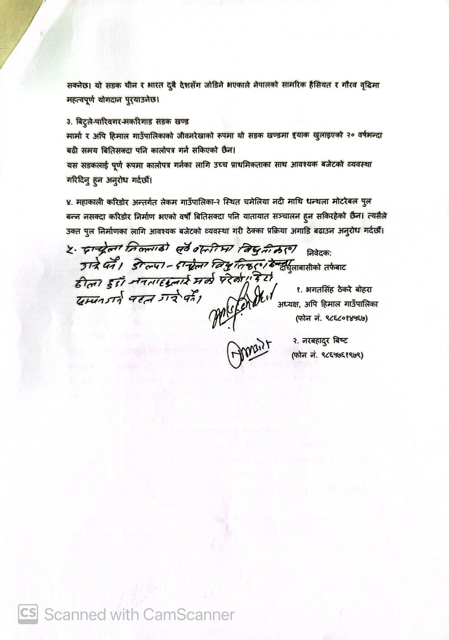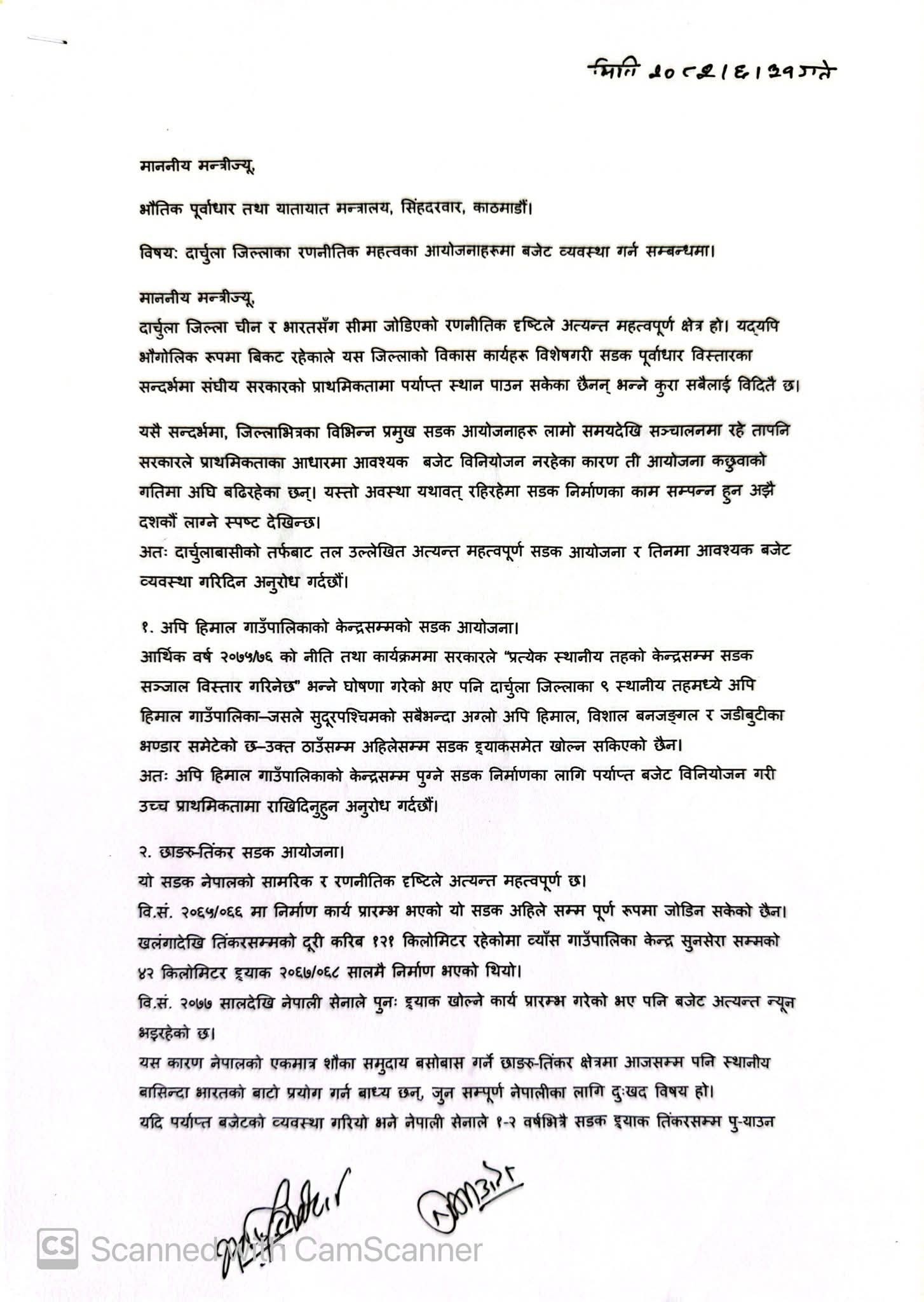 नेकपा माओवादी केन्द्रका युवा नेता भगतसिंह ठेकेरे बोहरा र नरबहादुर विष्टले जिल्लाको विकास निर्माणका कार्यका लागि भौतिक पूर्वाधार तथा यातायात, शहरी विकास, उर्जा, जलस्रोत तथा सिचाई मन्त्री कुलमान घिसिङसँग भेटघाट गरी आज लिखित माग पेश गरेका छन्।