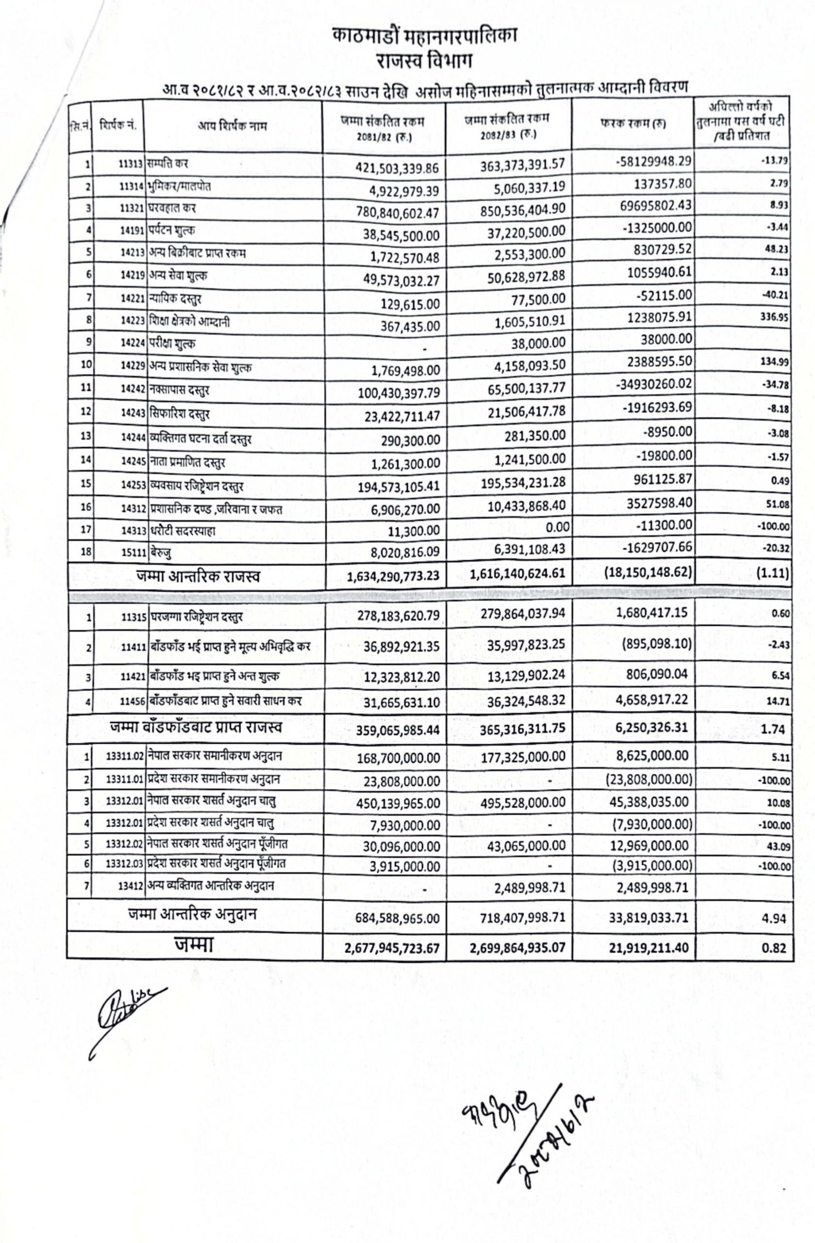 विशेषत: सम्पत्ति करमा १३.७९ प्रतिशत, पर्यटन शुल्कमा ३.४४ प्रतिशत, नक्सापास दस्तुरमा ३४.७८ प्रतिशत र धरौटीमा शतप्रतिशतले गिरावट आएको छ। नक्सापास दस्तुरमा अघिल्लो वर्ष १० करोड ४३ लाख ९७ हजार ७७ रुपैयाँ ७९ पैसा सङ्कलन भएकोमा, यस वर्ष ६ करोड ५५ लाख १ हजार ३ सय ७७ रुपैयाँ ७७ पैसामा झरेको छ।