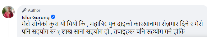 इशा गुरुङ्ग द्वारा प्रकाश लाई १ लाख सहयोग दिने घोषणा