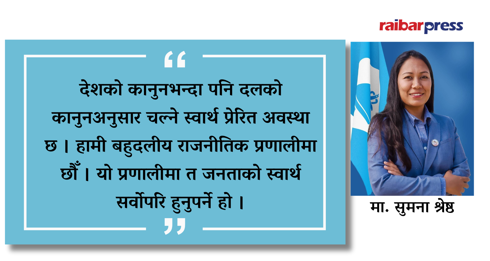 देशको कानुनभन्दा पनि दलको कानुनअनुसार चल्ने स्वार्थ प्रेरित अवस्था छ । हामी बहुदलीय राजनीतिक प्रणालीमा छौँ । यो प्रणालीमा त जनताको स्वार्थ सर्वोपरि हुनुपर्ने हो । तर दलीय स्वार्थभन्दा माथि उठ्न नसकेका दलहरूका कारण आमनागरिकका कैयौँ मुद्दा, गुनासा र स्वर मधुरा र दबिएका छन् । जनप्रतिनिधि पनि जनताका बन्न सकेनन्, उनीहरू जनताका साझा बन्न सकेनन् ।