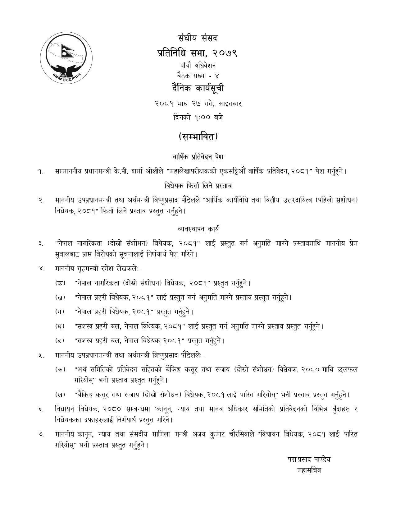 गृहमन्त्री रमेश लेखकले ‘नेपाल नागरिकता (दोस्रो संशोधन) विधेयक, २०८१,’ नेपाल प्रहरी विधेयक २०८१ लाई प्रस्तुत गर्न अनुमति माग्ने प्रस्ताव प्रस्तुत गर्ने, प्रस्ताव गर्ने, सशस्त्र प्रहरी बल, नेपाल विधेयक, २०८१ लाई प्रस्ताव गर्न अनुमति माग्ने प्रस्ताव प्रस्तुत गर्ने र प्रस्ताव गर्ने कार्यसूचीमा उल्लेख गरिएको छ ।