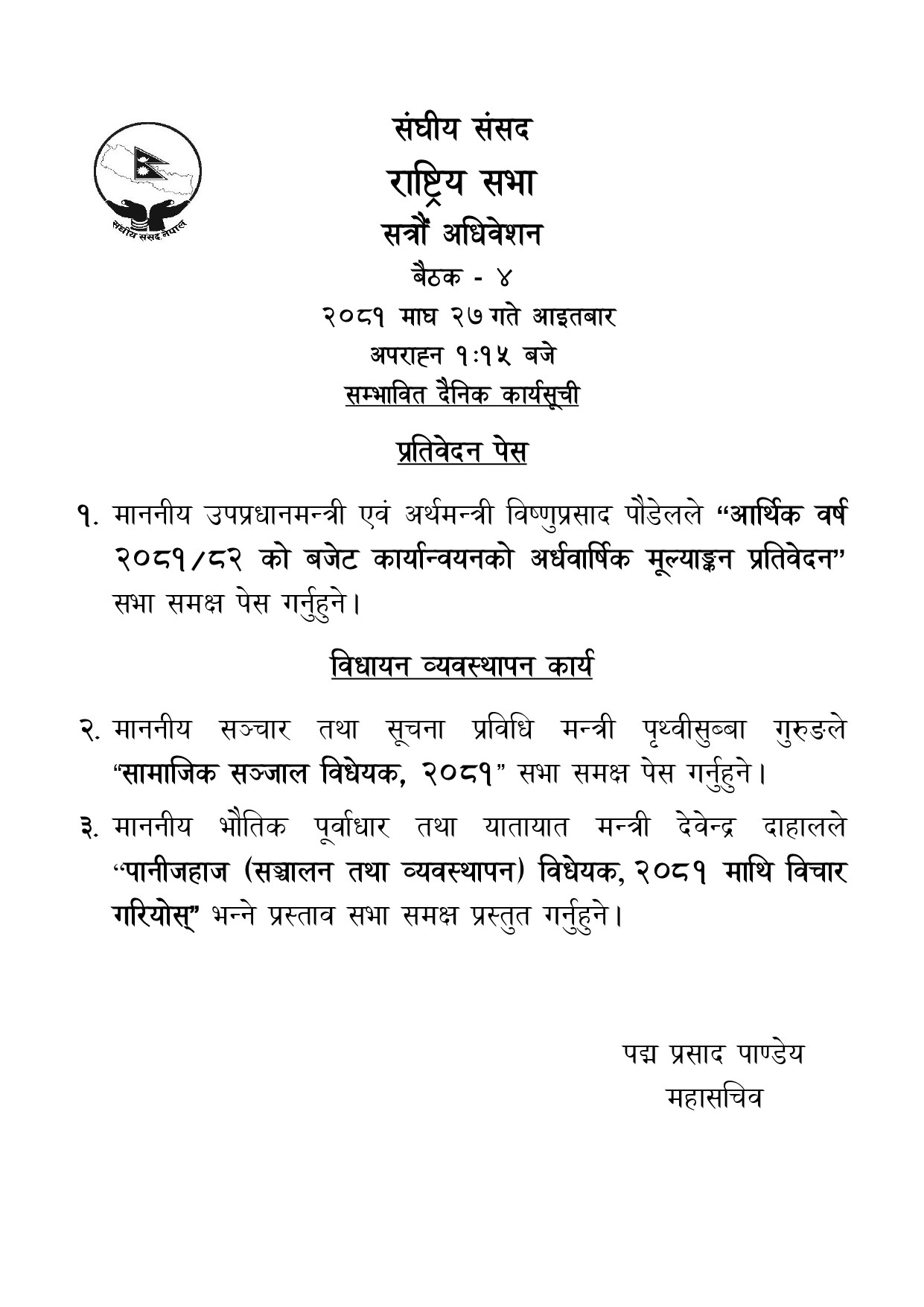 त्यस्तै सञ्चार तथा सूचना प्रविधिमन्त्री पृथ्वीसुब्बा गुरुङले ‘सामाजिक सञ्जाल विधेयक, २०८१’ सभासमक्ष पेस गर्ने सम्भावित कार्यसूची रहेको छ । भौतिक पूर्वाधार तथा यातायात मन्त्री देवेन्द्र दाहालले ‘पानीजहाज (सञ्चालन तथा व्यवस्थापन) विधेयक, २०८१ माथि विचार गरियोस्’ भन्ने प्रस्ताव सभा समक्ष प्रस्तुत गर्नेछन् ।