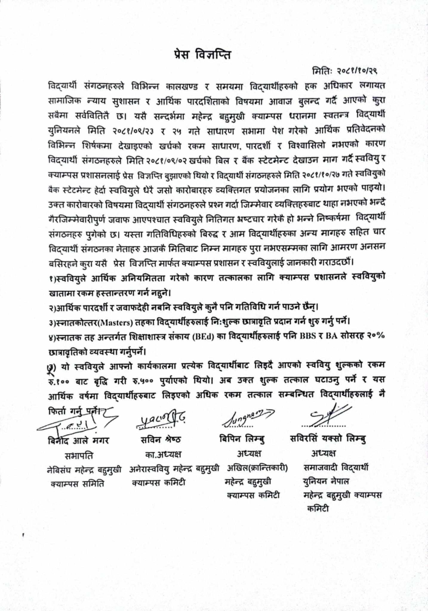 नेपाली कांग्रेस निकट नेपाल विद्यार्थी संगठन (नेविसंघ)का अध्यक्ष विनोद आले मगर, नेकपा (एमाले) निकट अखिल नेपाल राष्ट्रिय स्वतन्त्र विद्यार्थी युनियन (अनेरास्ववियु)का अध्यक्ष सविन श्रेष्ठ, माओवादी केन्द्र (निकट) अखिल (क्रान्तिकारी)का अध्यक्ष विपीन लिम्बु, एकीकृत समाजवादी निकट सामाजवादी विद्यार्थी युनियनका अध्यक्ष सविरसिंह यक्सो लिम्बुले संयुक्त प्रेस विज्ञप्ति जारी गरी महेन्द्र बहुमुखी क्याम्पसको स्ववियुले आर्थिक अपारदर्शिता गरेको भन्दै आमरण अनशन सुरु गरेको अखिल (क्रान्तिकारी)का अध्यक्ष लिम्बुले जानकारी दिए ।