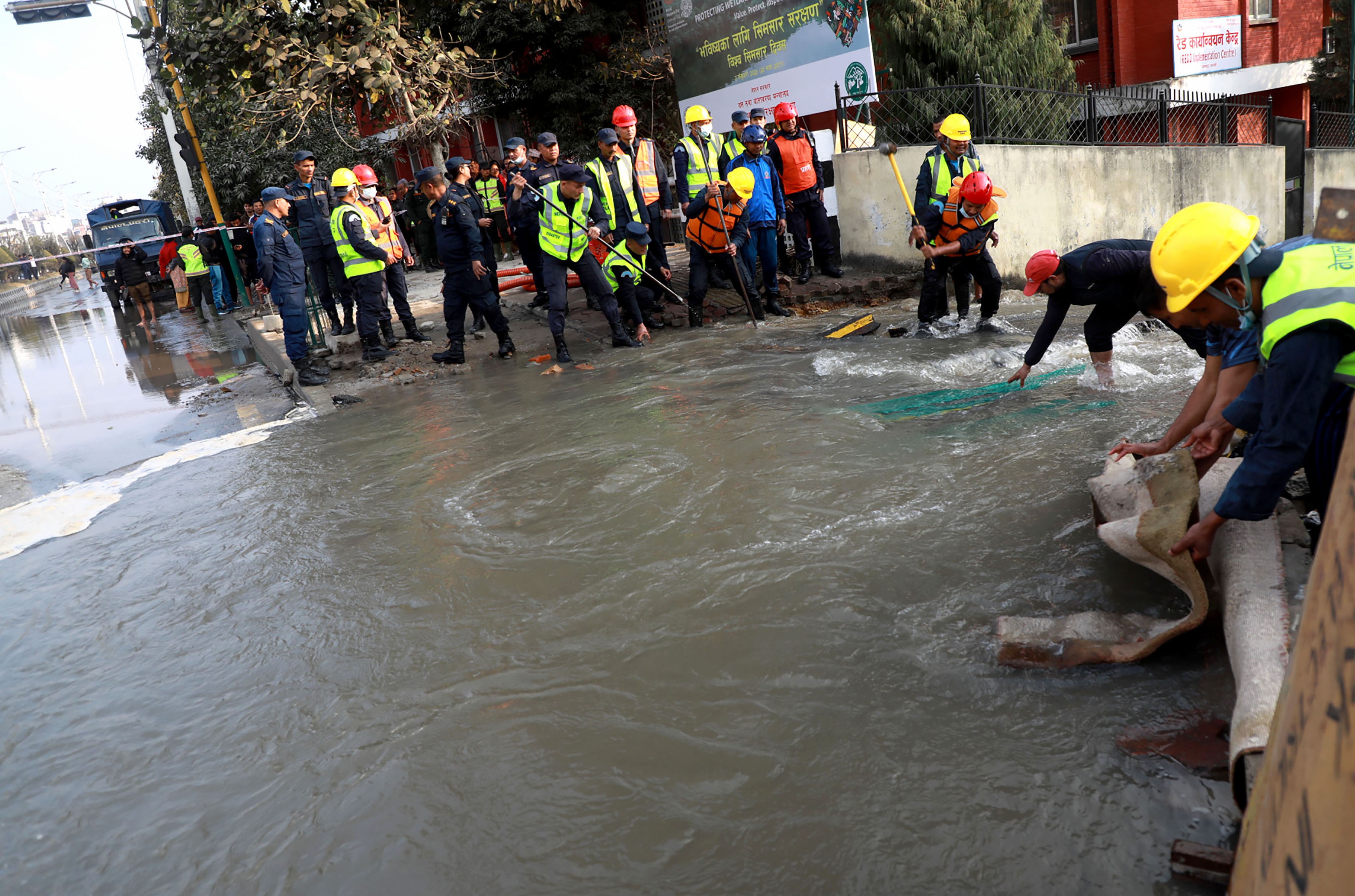 काठमाडौं उपत्यका खानेपानी आयोजना कार्यान्वयन निर्देशनालय (पिआइडी)का प्रमुख टीकाबहादुर चौधरीले विद्युत्का तारहरू अण्डरग्राउण्ड गर्नका लागि ‘होेरिजोन्टल ड्रिलिङ’ गर्ने क्रममा खानेपानीको थोक वितरण प्रणालीको पाइप फुटेको राससलाई जानकारी दिए । उनले भने, “पाइप फुटेपछि पानी वितरण गर्ने भल्ब बन्द गरी पाइप सफा गर्नेकाम (वास आउट) भइरहेको छ । हालसम्म पानी बग्न भने रोकिएको छैन ।”