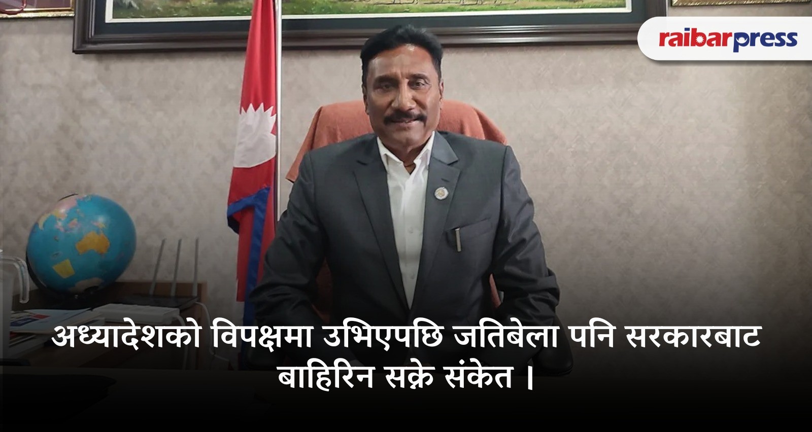 बिहीबार सर्लाहीमा आयोजित कार्यकर्ता भेटघाटमा अध्यक्ष ठाकुरले अध्यादेशको विपक्षमा उभिएपछि सरकारमा बस्नुको औचित्य नरहेको भन्दै जतिबेला पनि बाहिरिन सक्ने संकेत गरे ।