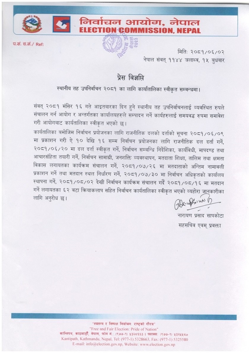 मङ्सिर १६ गतेको उपनिर्वाचनका लागि निर्वाचन आयोगद्वारा कार्यतालिका सार्वजनिक
