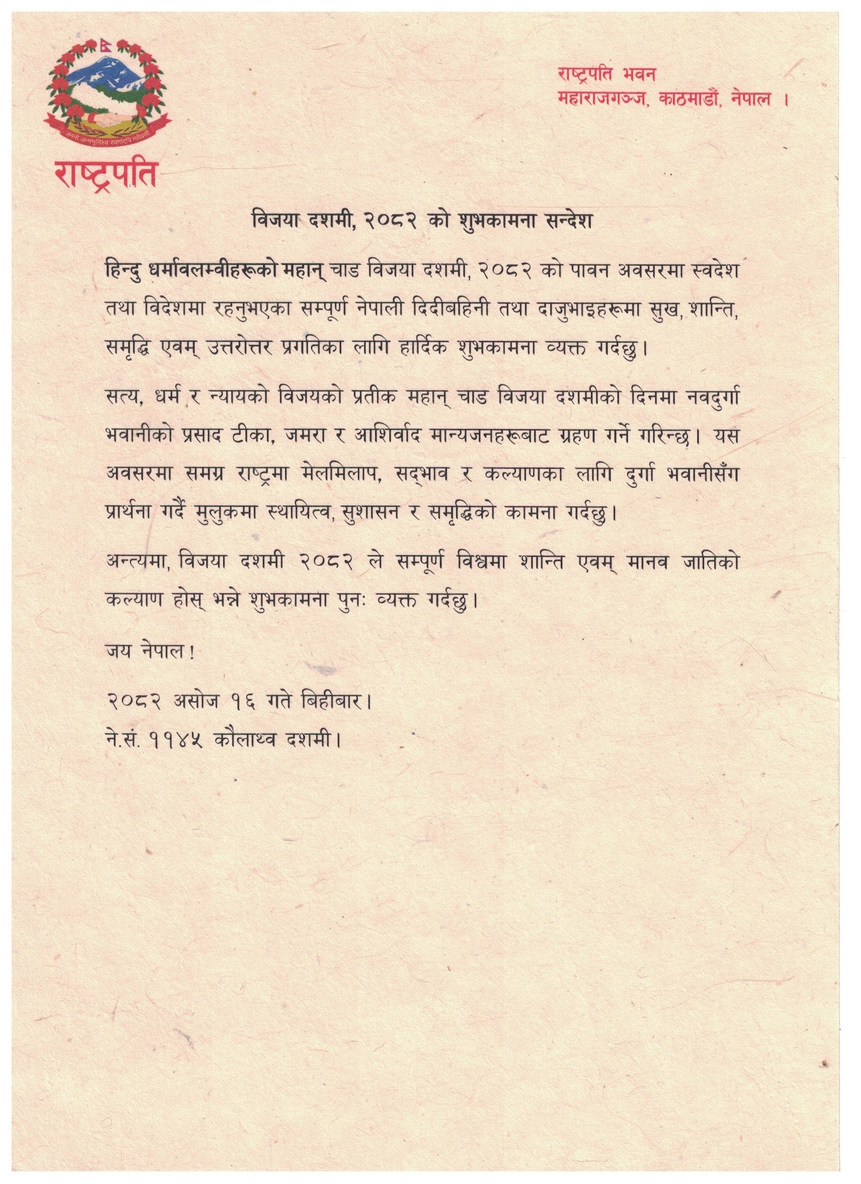 बिहीबार (२०८२ असोज १६ गते) शुभकामना सन्देश जारी गर्दै राष्ट्रपति पौडेलले सम्पूर्ण नेपालीको सुख, शान्ति, समृद्धि र उत्तरोत्तर प्रगतिका लागि शुभेच्छा प्रकट गरेका छन्।