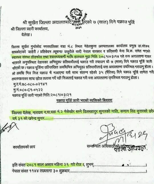 सुनारविरुद्ध सुर्खेत जिल्ला अदालतमा स्वास्थ्य संस्था तोडफोड र स्वास्थ्यकर्मीमाथि हातपात सम्बन्धी मुद्दा दर्ता भएको छ। सोही मुद्दामा अदालतले २०८१ असार २१ गते पक्राउ पुर्जी जारी गरेको थियो। मेहेलकुना अस्पतालका कार्यालय प्रमुख डा. सोजन सापकोटाले जाहेरी दिएपछि अदालतले सात दिनभित्र सुनारलाई पक्राउ गरी उपस्थित गराउन जिल्ला प्रहरी कार्यालय दैलेखलाई निर्देशन दिएको थियो।