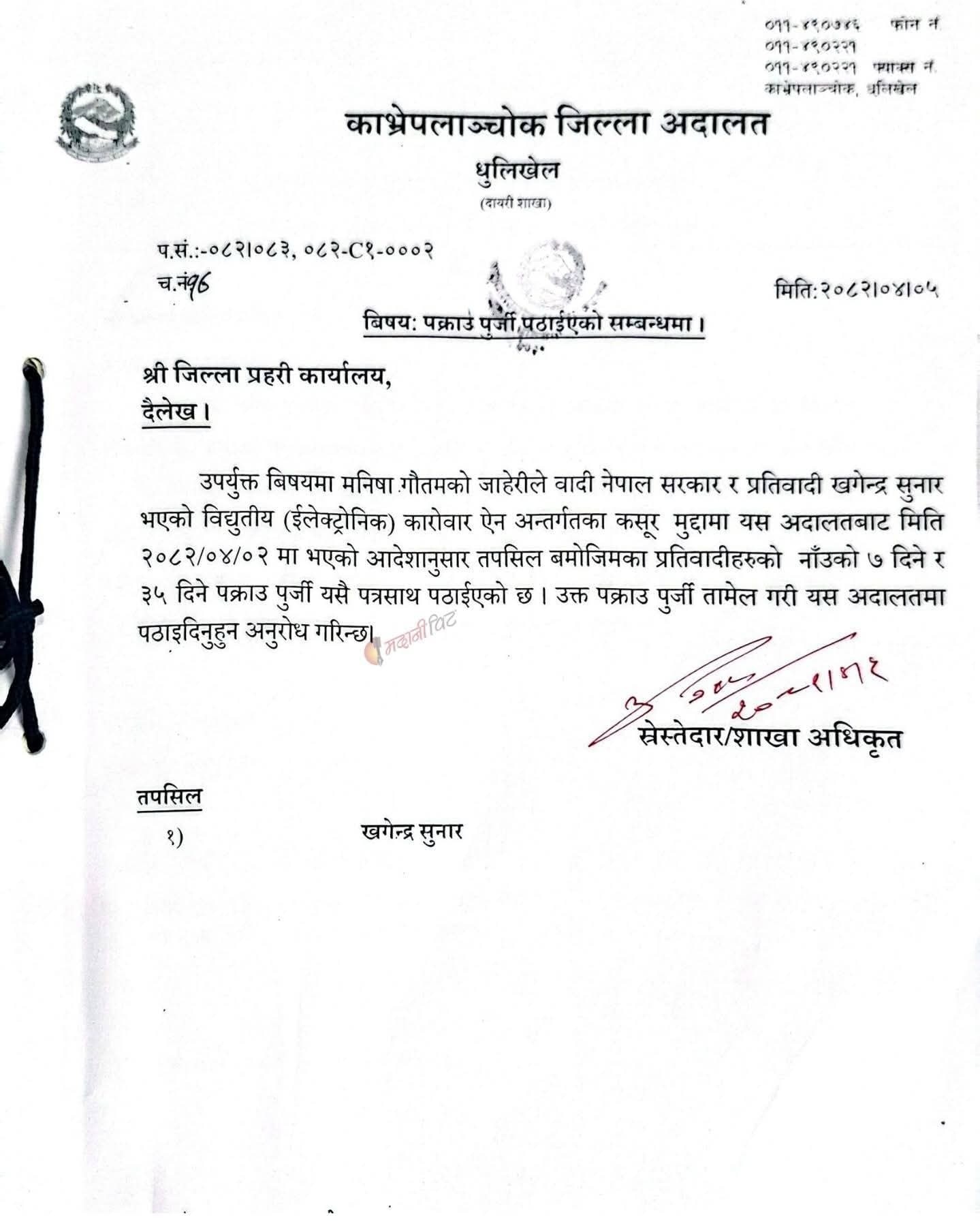 त्यस्तै, काभ्रे जिल्ला अदालतबाट पनि उनीविरुद्ध विद्युतीय कारोबारसम्बन्धी अर्को मुद्दामा पक्राउ पुर्जी जारी भएको छ। यी दुवै मुद्दा अहिलेसम्म फर्स्यौट नभएको र उनी फरार अभियुक्तको सूचीमा रहेको प्रहरी स्रोतले जनाएको छ।