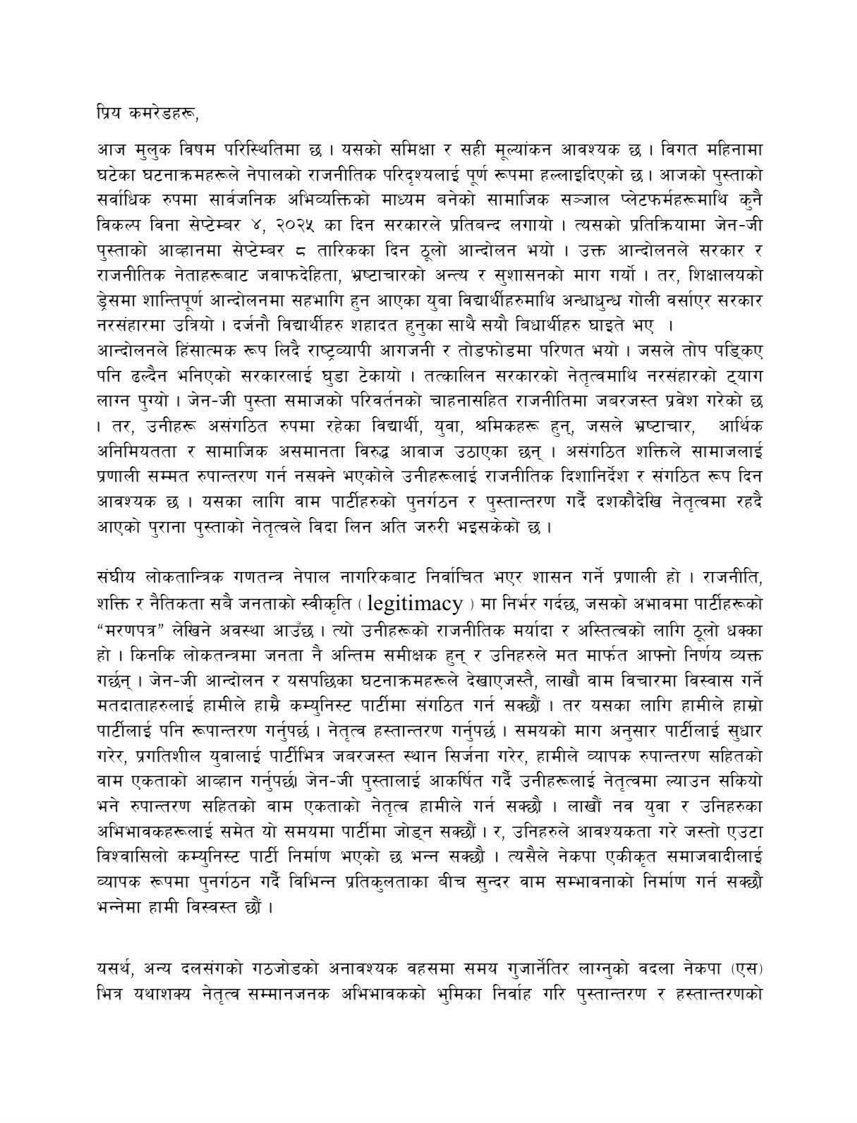‘तर, यसका लागि हामीले हाम्रो पार्टीलाई पनि रूपान्तरण गर्नुपर्छ । नेतृत्व हस्तान्तरण गर्नुपर्छ,’ विज्ञप्तिमा भनिएको छ, ‘समयको मागअनुसार पार्टीलाई सुधार गरेर, प्रगतिशील युवालाई पार्टीभित्र जबरजस्त स्थान सिर्जना गरेर हामीले व्यापक रुपान्तरणसहितको वाम एकताको आह्वान गर्नुपर्छ ।’