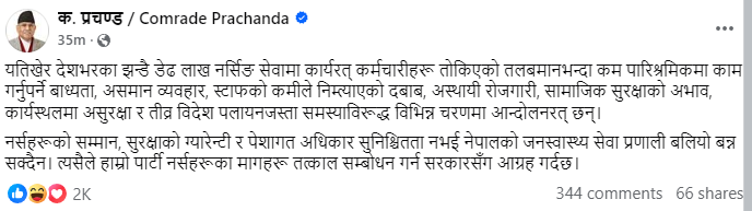 सामाजिक सञ्जाल फेसबुक मार्फत जारी एक संक्षिप्त वक्तव्यमा अध्यक्ष प्रचण्डले नर्सहरूले भोगिरहेका तलब–पारिश्रमिकको असमानता, अस्थायी रोजगारी, सामाजिक सुरक्षाको अभाव र कार्यस्थलमा असुरक्षाजस्ता समस्यालाई गम्भीर विषयका रूपमा औंल्याएका छन्।