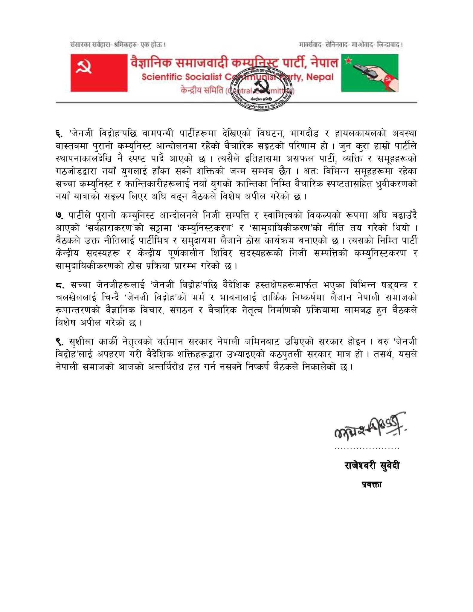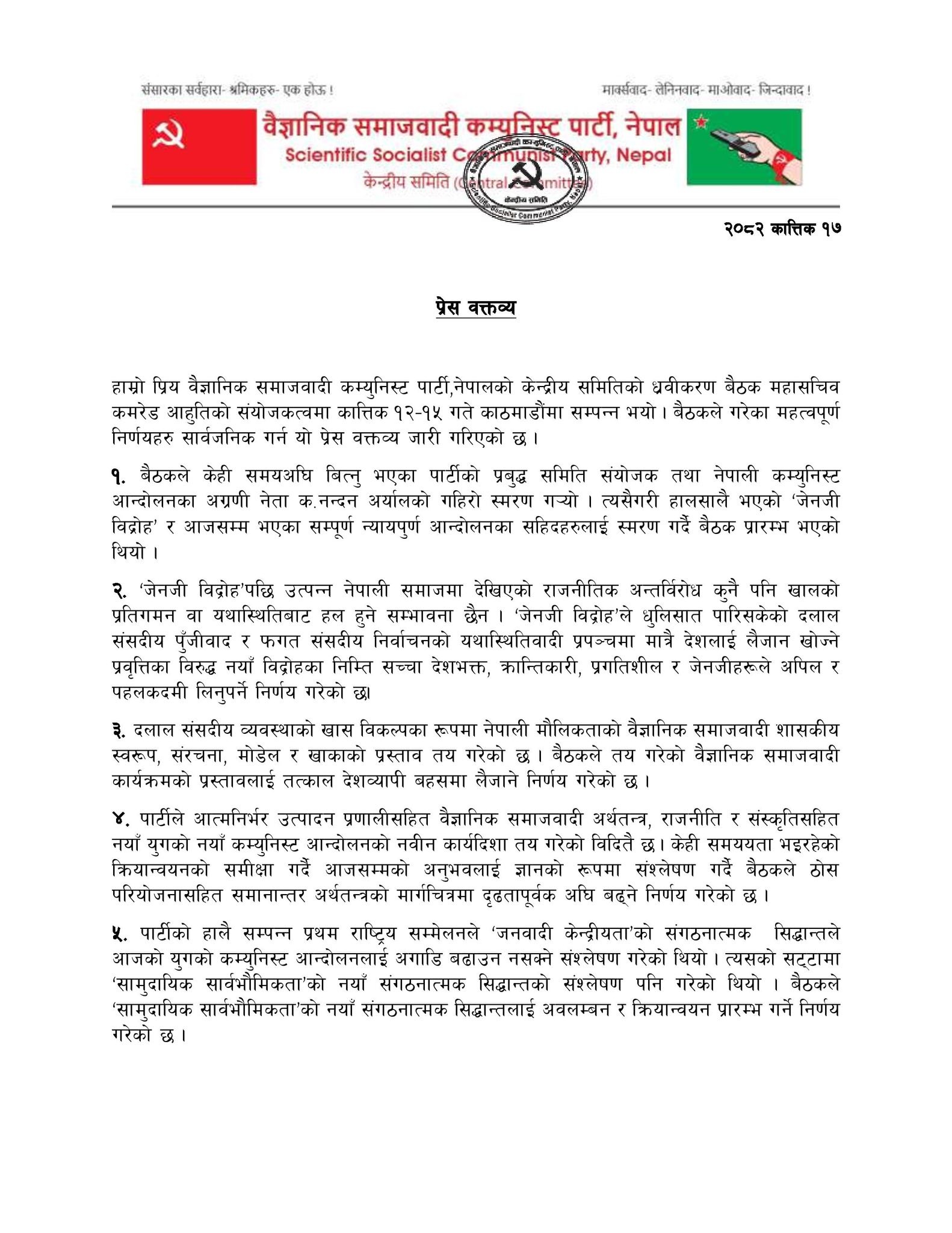 आहुति नेतृत्वको वैज्ञानिक समाजवादी कम्युनिस्ट पार्टी, नेपालले आफ्नो हालै सम्पन्न केन्द्रीय कमिटी बैठकपछि प्रेस विज्ञप्ति जारी गर्दै वर्तमान सरकार र जेनजी आन्दोलनसम्बन्धी आफ्नो धारणा सार्वजनिक गरेको छ।