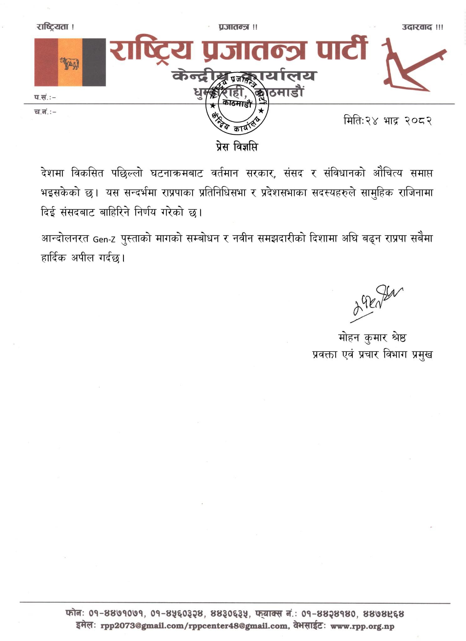 राप्रपाका संघीय तथा प्रदेश सभाका सांसदहरूले गत भदौ २४ गते सामूहिक राजीनामा दिएका थिए। सामूहिक राजीनामा दिएकामध्येकी एक सांसद अहिले मन्त्री बनेकी हुन्।