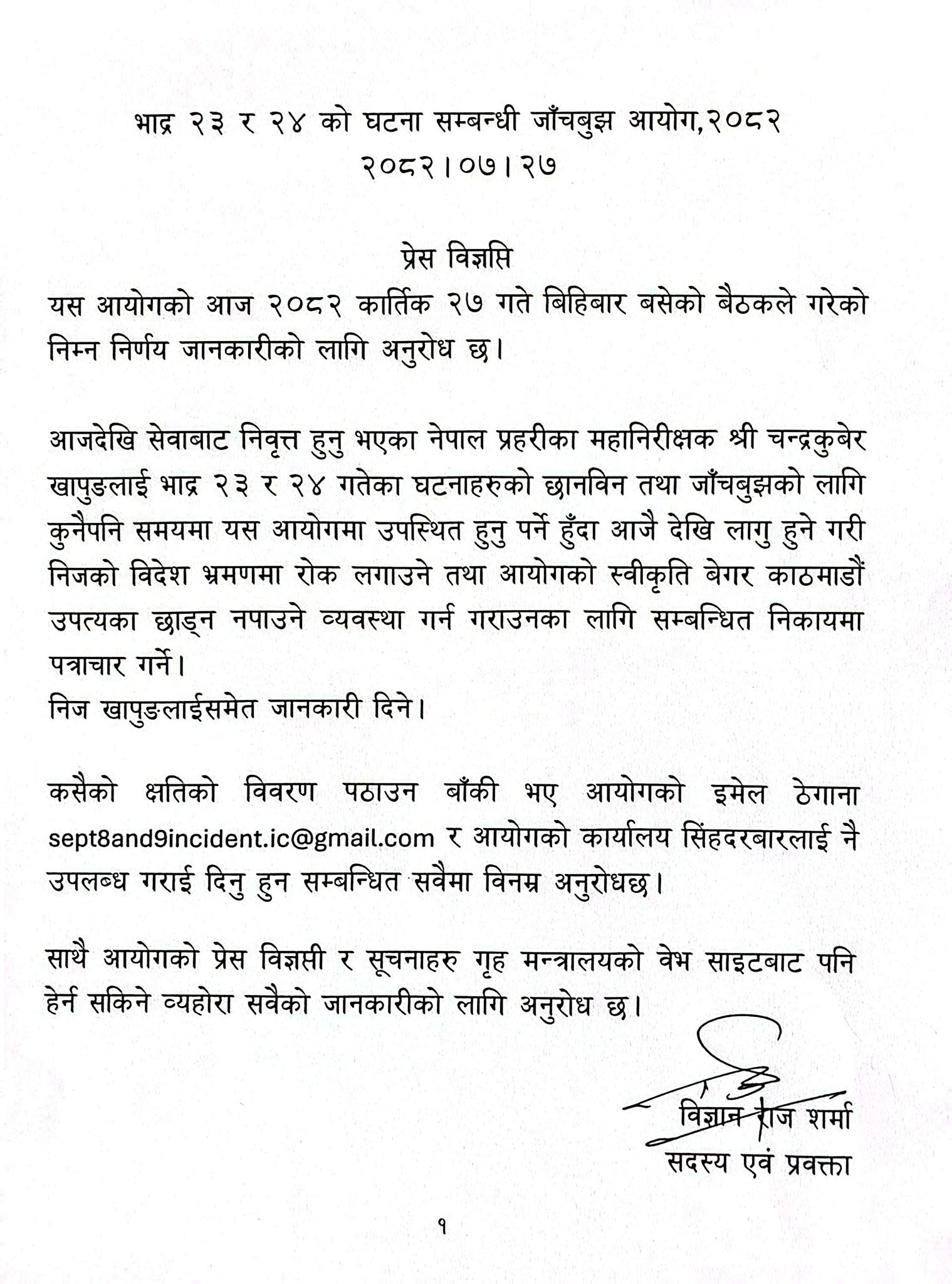 २३ र २४ भदौमा भएका घटनाबारे छानबिन गर्न गठन गरिएको उच्चस्तरीय जाँचबुझ आयोगले आज एक विज्ञप्ति जारी गर्दै जानकारी दिएको हो।
