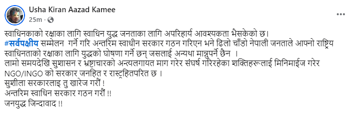 सामाजिक सञ्जाल फेसबुकमा स्टाटस लेख्दै आजादले “स्वाधीनताको रक्षाका लागि स्वाधीन युद्ध अब जनताका लागि अपरिहार्य आवश्यकता बनेको” दाबी गरेका छन्।