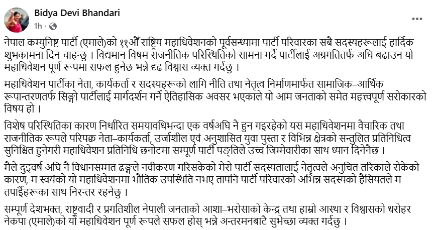 नेकपा (एमाले)को ११औँ राष्ट्रिय महाधिवेशनको पूर्वसन्ध्यामा पूर्व राष्ट्रपती विद्यादेवी भण्डारीले पार्टी नेतृत्वप्रति गम्भीर असन्तुष्टि व्यक्त गर्दै आफू पार्टीको आम कार्यकर्तासँगै रहने प्रतिबद्धता जनाएकी छन् ।