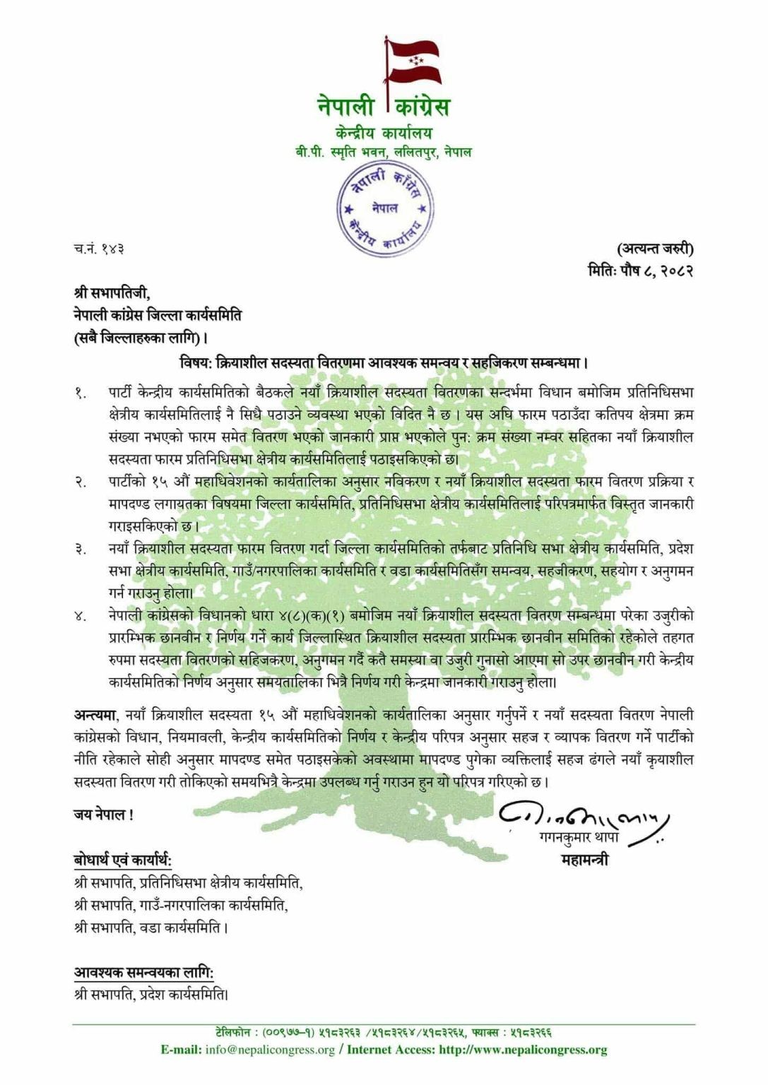 मंगलबार साँझ सबै जिल्लालाई लक्षित गर्दै जारी गरिएको उक्त परिपत्रमा भनिएको छ कि नयाँ क्रियाशील सदस्यता १५औँ महाधिवेशनको कार्यतालिकाअनुसार वितरण गर्नुपर्ने छ।