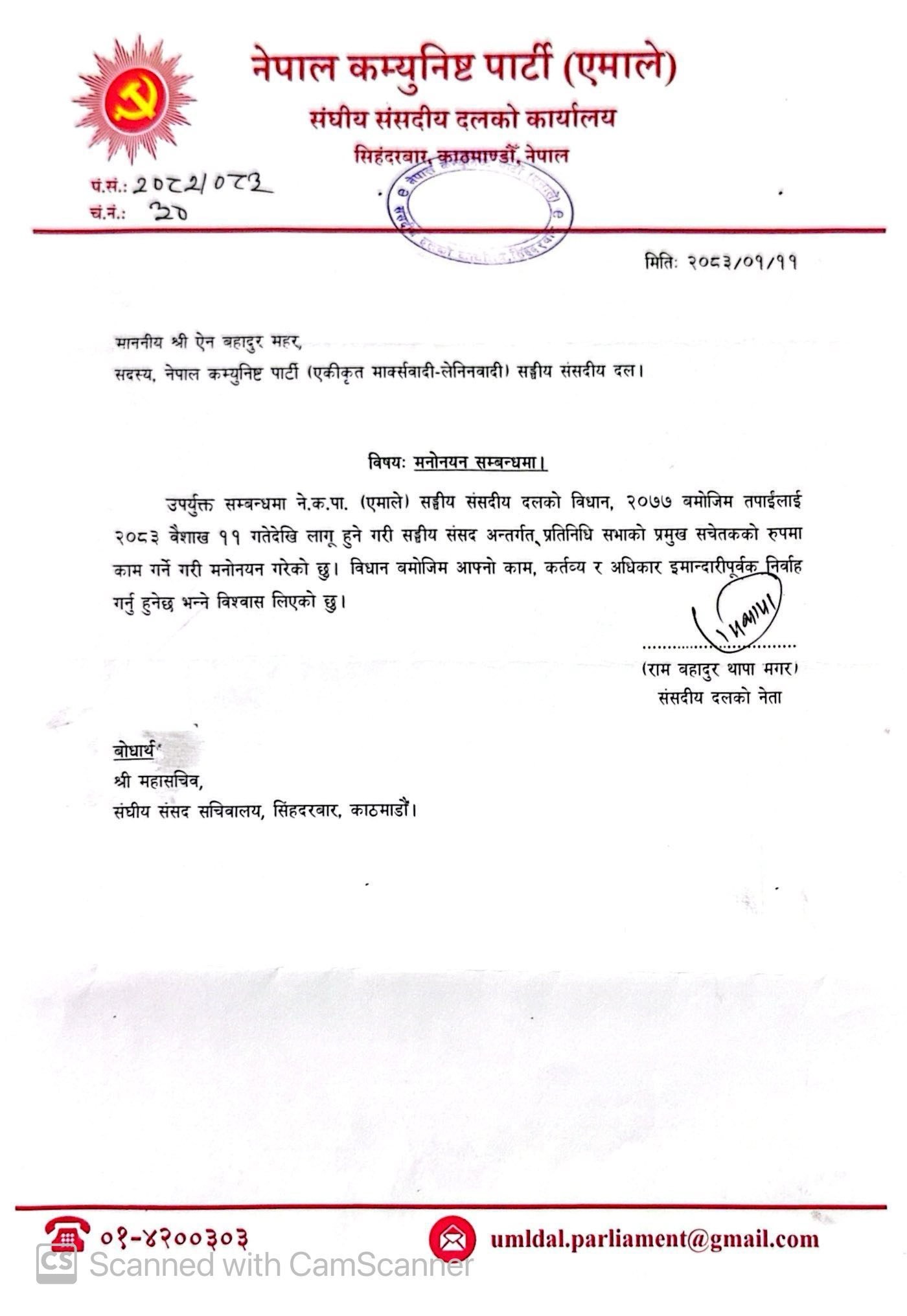 एमाले संसदीय दलका नेता रामबहादुर थापा मगर ले सङ्घीय संसदीय दलको विधान २०७७ बमोजिम शुक्रबारदेखि लागू हुने गरी महरलाई उक्त जिम्मेवारी सुम्पिएका हुन्।
