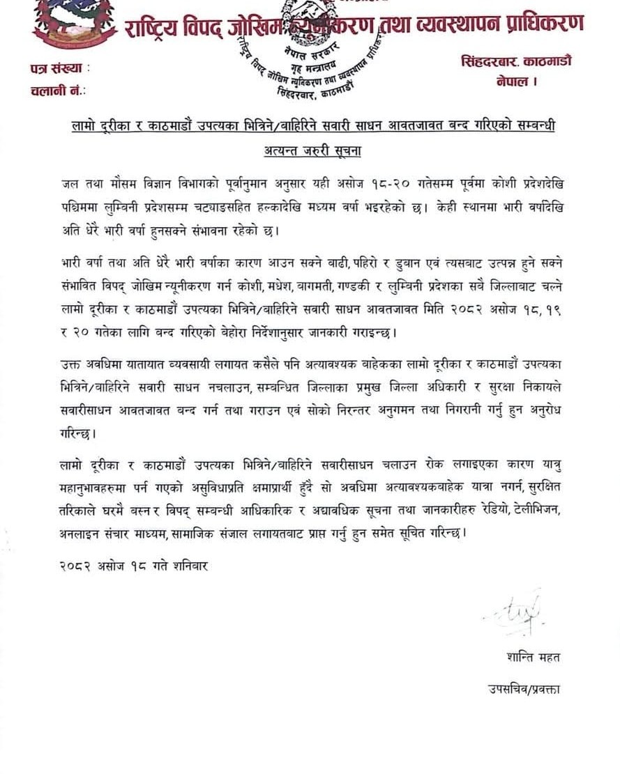 प्राधिकरणले जारी गरेको विज्ञप्तिमा पनि वर्षाको उच्च जोखिमलाई ध्यानमा राख्दै उपत्यका भित्रने तथा बाहिरिने सबै राजमार्ग आगामी तीन दिनसम्म पूर्णरूपमा बन्द रहने उल्लेख गरिएको छ ।