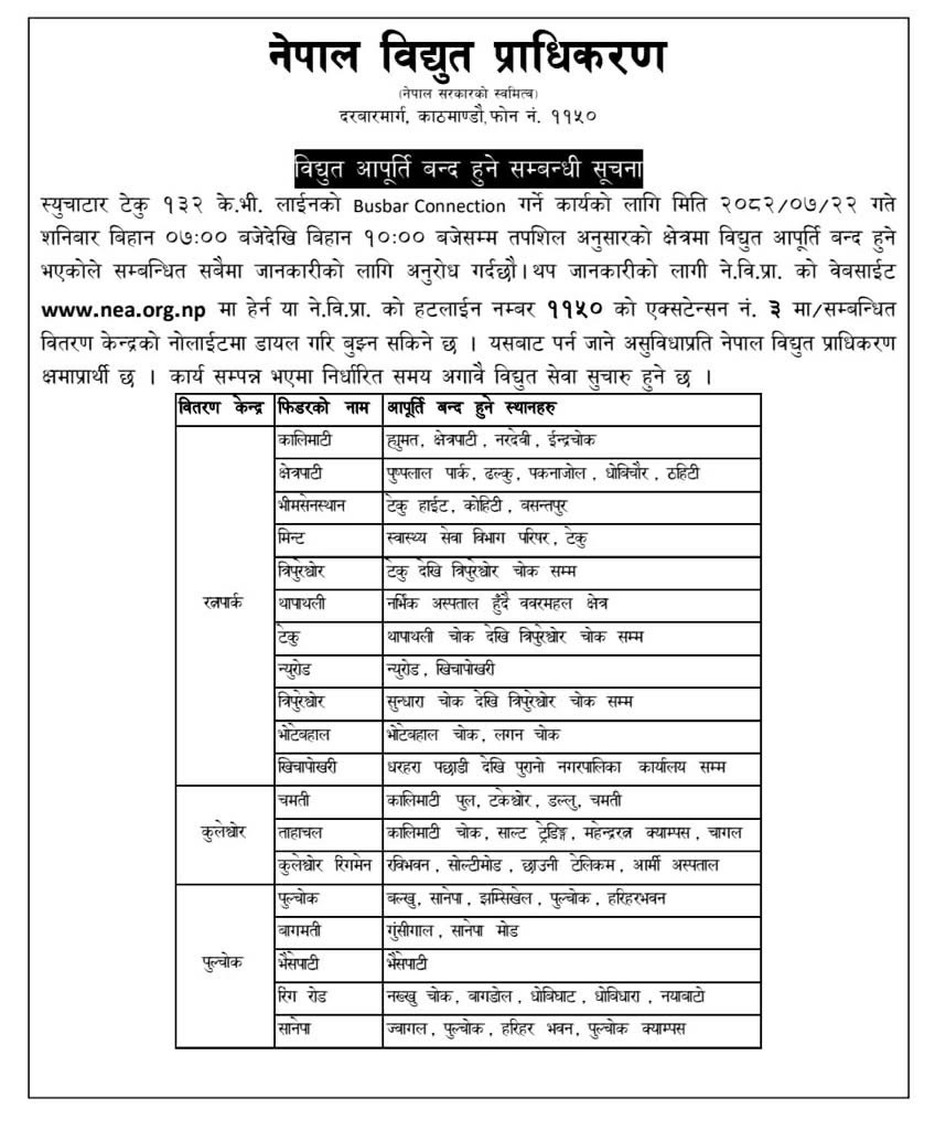 प्राधिकरणका अनुसार रत्नपार्क, कुलेश्वर र पुल्चोक वितरण केन्द्रअन्तर्गतका कालीमाटी, क्षेत्रपाटी, भीमसेनस्थान, मिन्ट, त्रिपुरेश्वर, थापाथली, टेकु, न्युरोड, भोटेबहाल, खिचापोखरी, चमती, ताहचल, कुलेश्वर, पुल्चोक, बागमती, भैसेपाटी, रिङरोड र सानेपा फिडरका क्षेत्रमा आपूर्ति बन्द गरिएको हो।