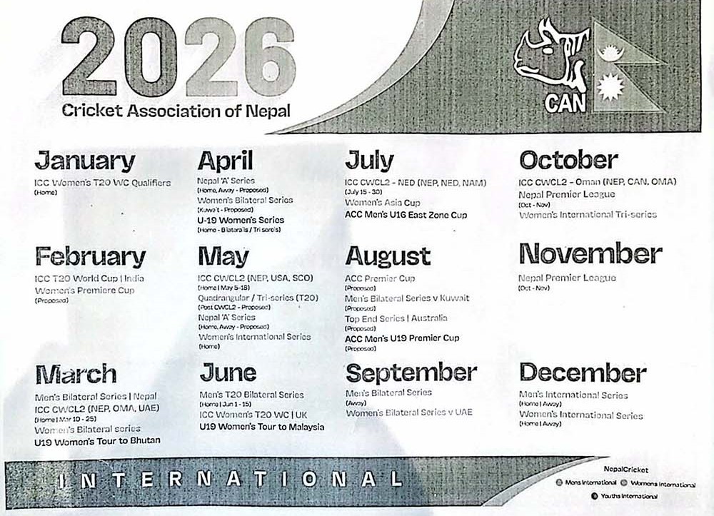 नेपाल क्रिकेट संघ (क्यान)ले सन् २०२६ को क्रिकेट क्यालेन्डर सार्वजनिक गरेको छ। क्यानले यस वर्ष नेपालमा घरेलु र अन्तर्राष्ट्रिय खेलहरू निरन्तर हुने गरी तालिका तयार पारेको हो।