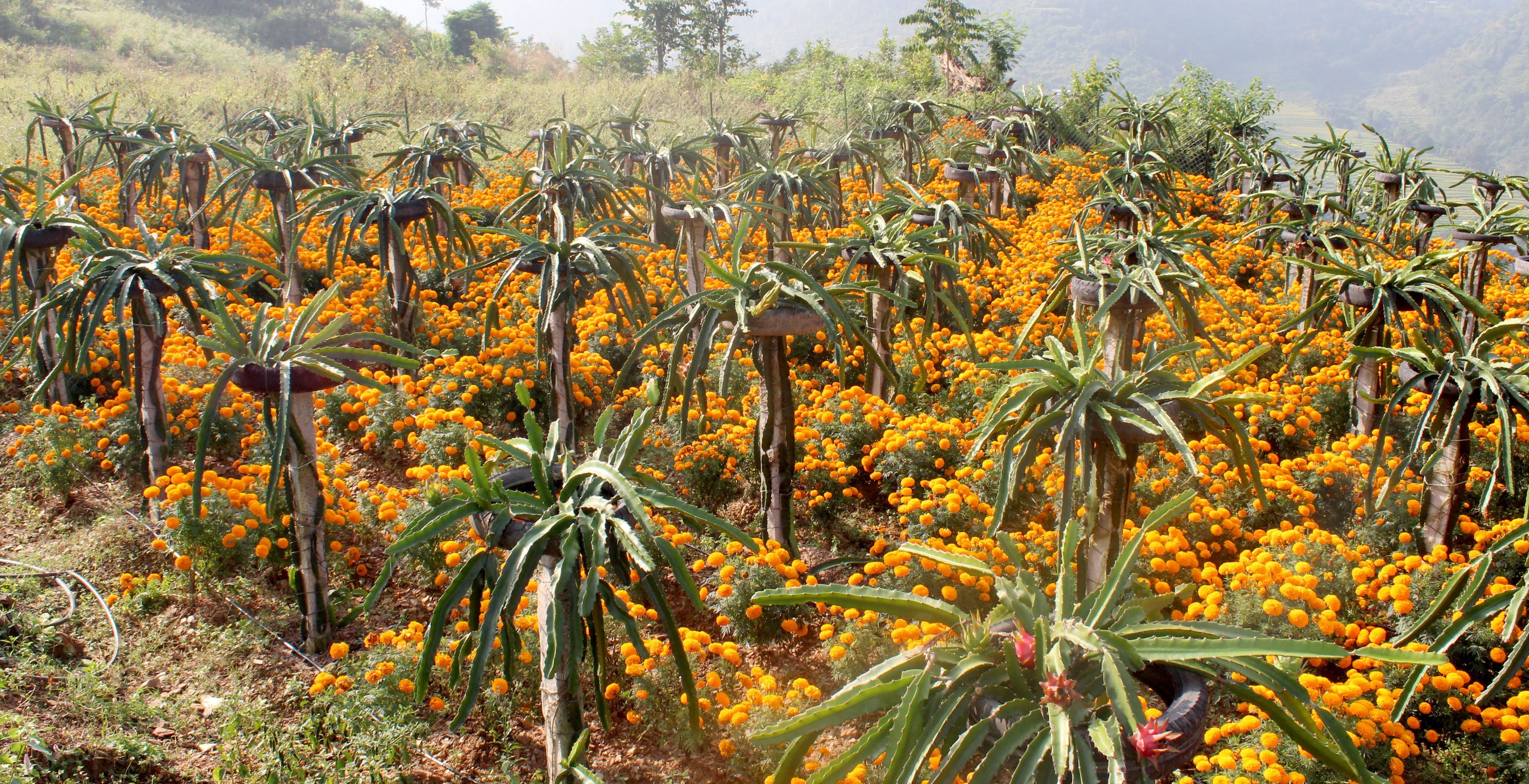 रामेछापको मन्थली नगरपालिका वडा नं ५ डाँडागाउँका स्थानीय रामबहादुर शाहीले व्यावसायिक रुपमा पाँच रोपनी जमिनमा गर्नुभएको सयपत्री फूल र ड्रागन फ्रुट खेती ।