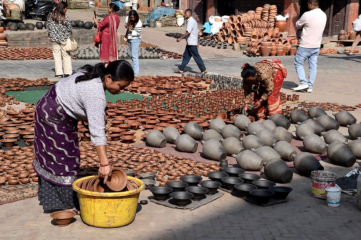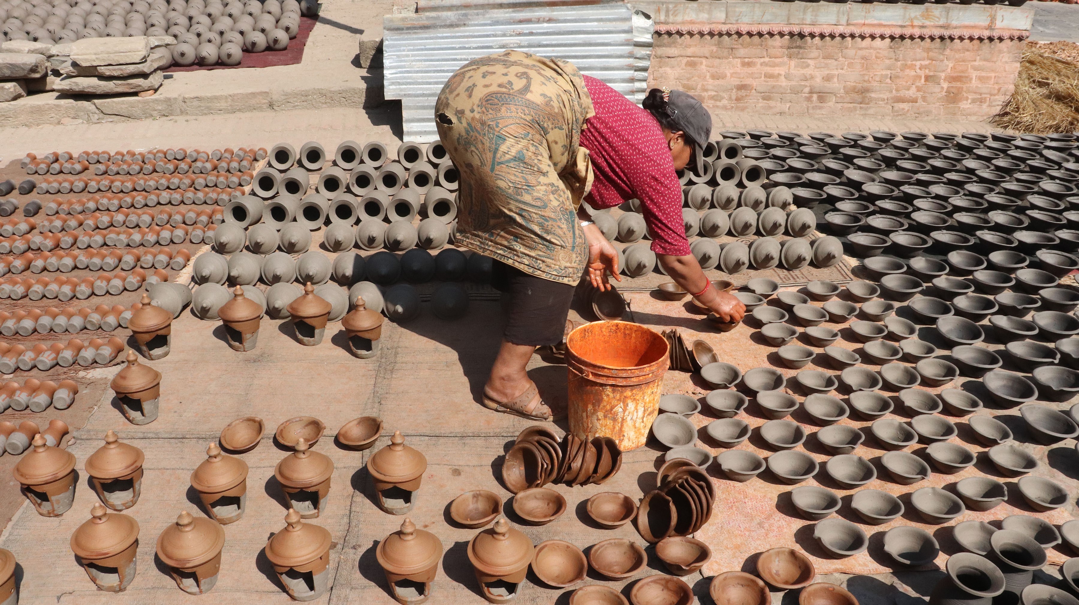 भक्तपुर नगरपालिका–४, बोलाछे तालाक्व (पोट्टरी स्क्वायर)मा तिहार र छठ पर्वका लागि बनाइएका माटाका भाडा घाममा सुकाउँदै महिला । तस्बिरः हरिराम भेटुवाल/रासस