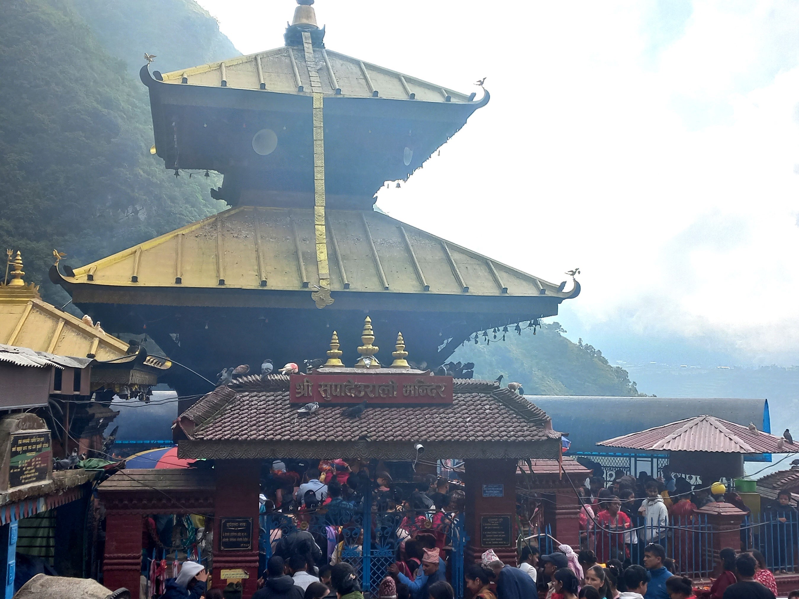 अर्घाखाँचीको प्रसिद्ध धार्मिक तथा पर्यटकीयस्थल सुपादेउराली मन्दिरमा पूजाअर्चनाका लागि आएका भक्तजन । यो मन्दिर सन्धिखर्क नगरपालिका र शितगङ्गा नगरपालिकाको सीमामा रहेको छ । तस्बिरः प्रेमनारायण आचार्य/रासस