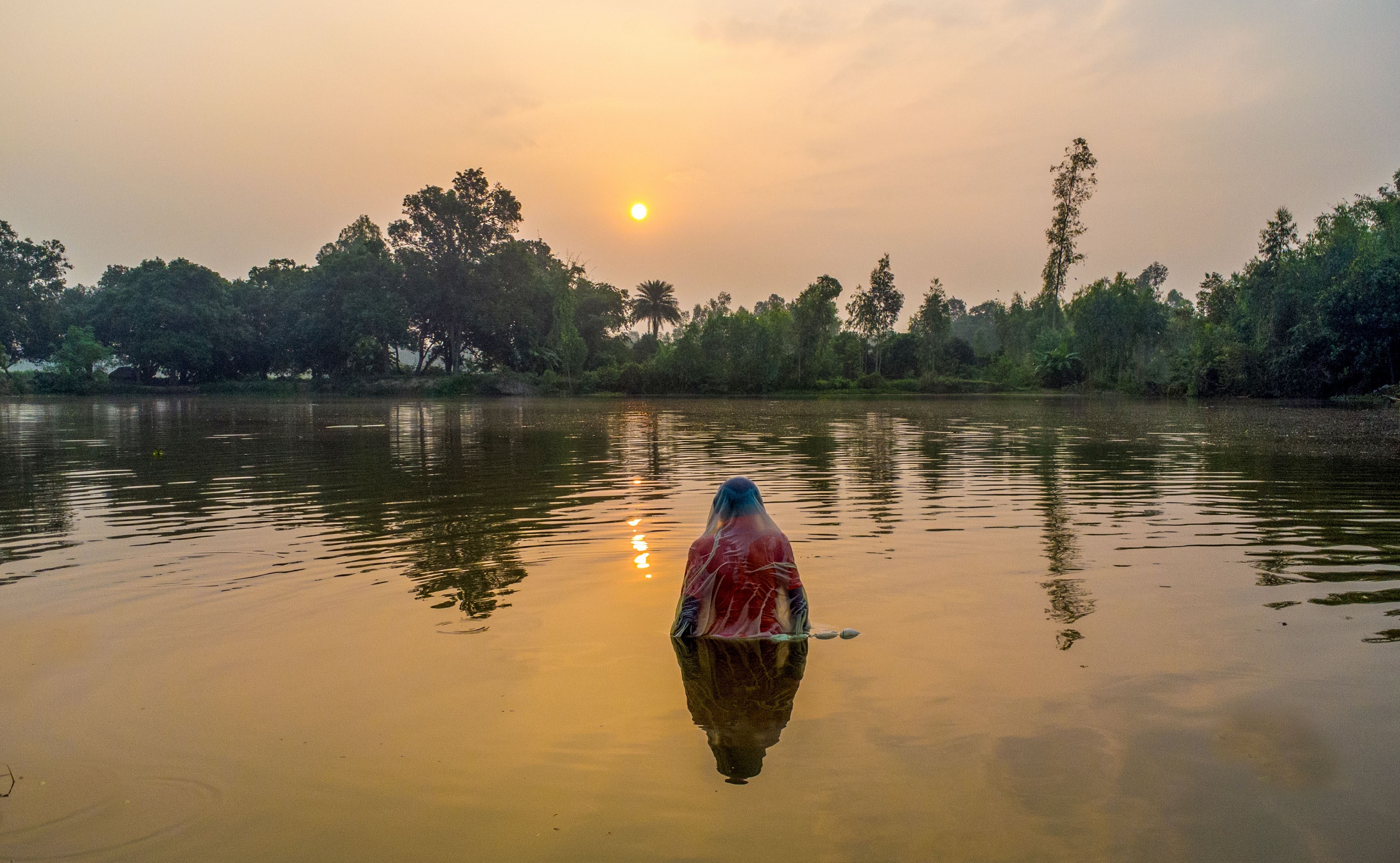 On the final day of Chhath Puja, on Friday, devotees stand in the Thaan Pond located in Kumharoul, Ward No. 4 of Kshireshwar Municipality, Dhanusha, worshipping the rising sun.
